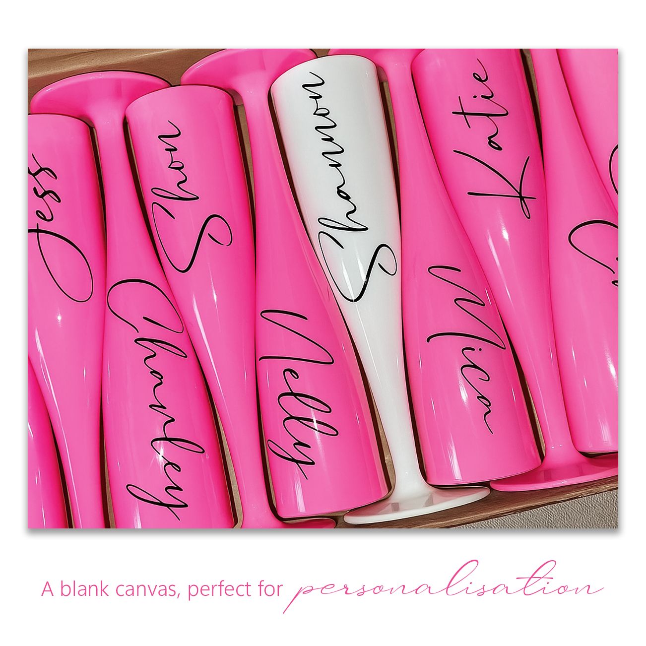 • COLOUR Classic champagne flutes in brilliant bubble gum pink with a single gloss white glass for the bride